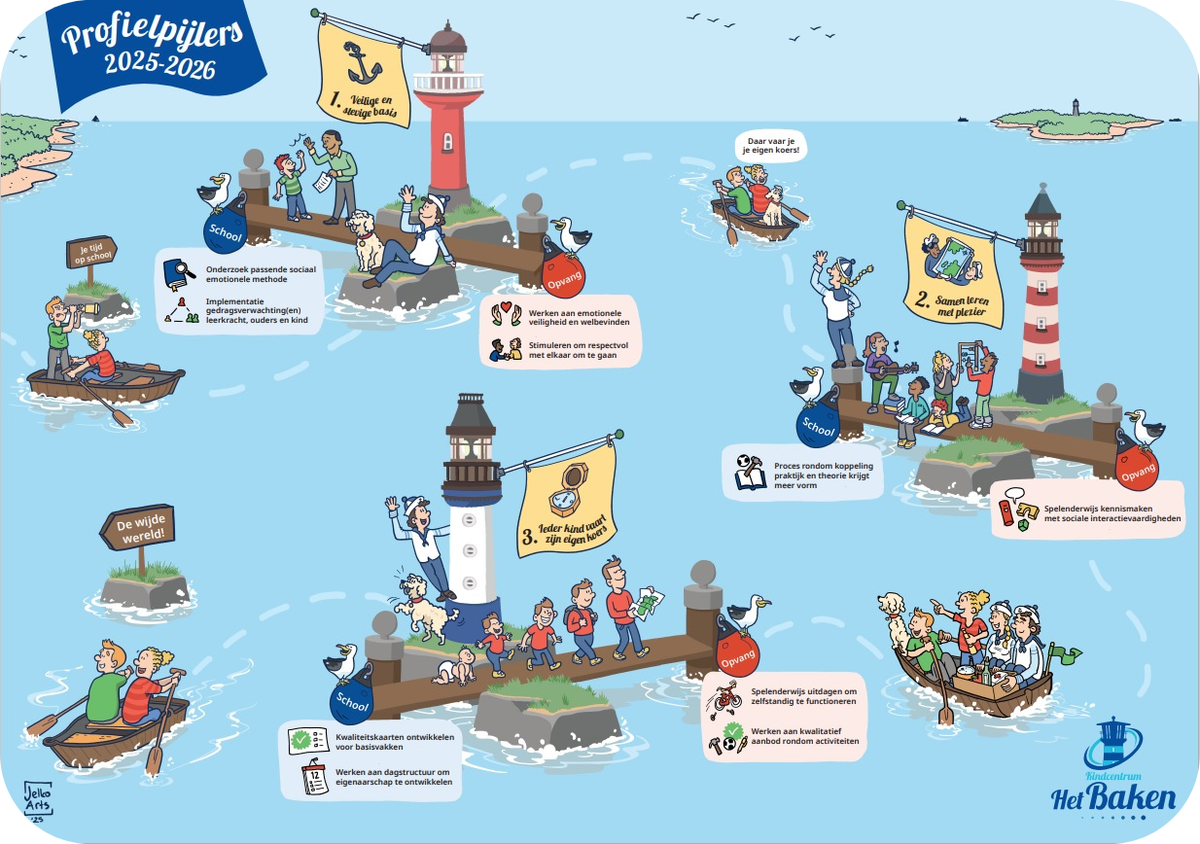 Kindcentrum Het Baken biedt onderwijs en opvang gericht op de toekomst. Vanuit de ontwikkelbehoeften van kinderen zorgen wij voor een uitdagende en inspirerende omgeving. Ieder kind doet ertoe op ons kindcentrum. Gezien worden, waardering en begrip krijgen zijn basisbehoeften van alle kinderen. Daarom benaderen wij elkaar op een positieve manier, vanuit waardering naar elkaar. We staan ’s morgens klaar om elk kind te begroeten om de dag vervolgens gezamenlijk te kunnen starten. We leren kinderen